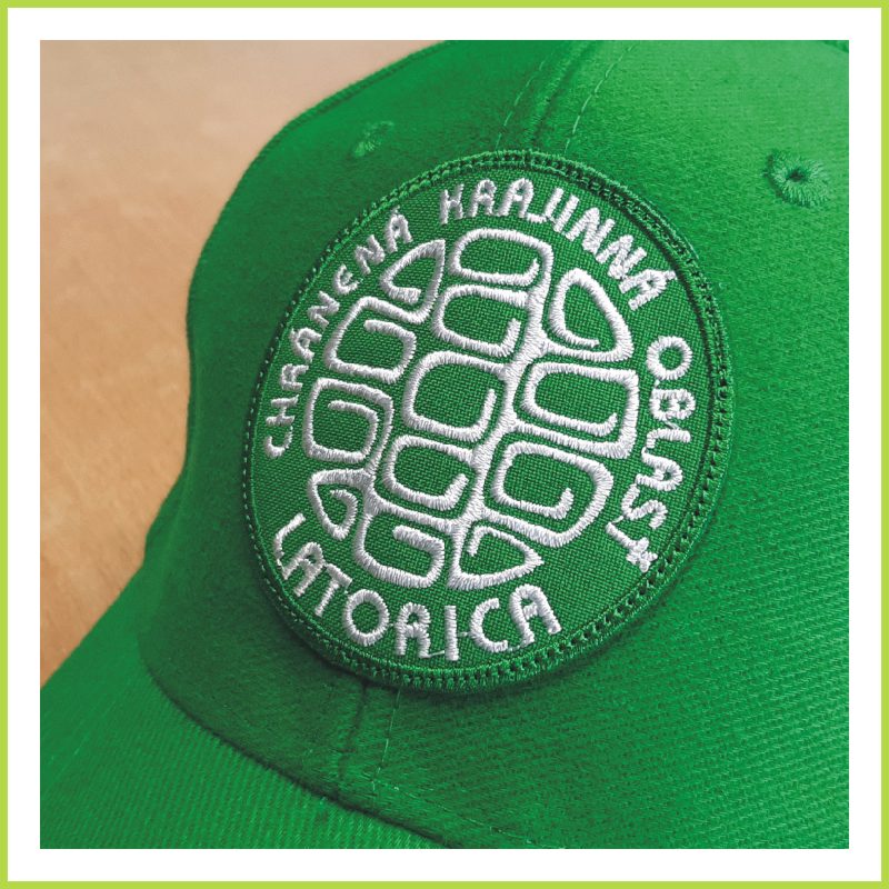 Dvojfarebná vyšívaná nášivka CHKO LATORICA našitá na prednej časti šiltovky.