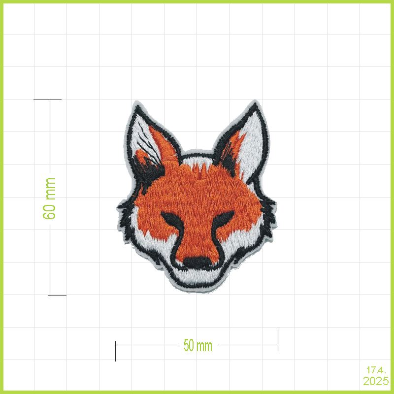 Mnohofarebná vyšívaná nášivka líščej hlavy.