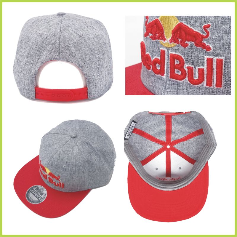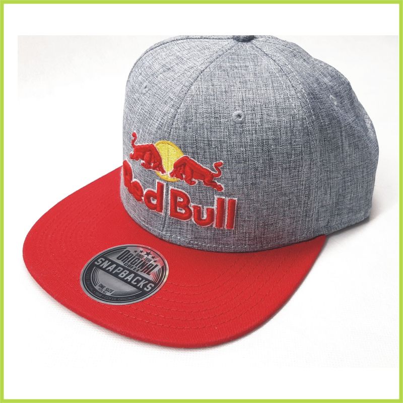 Trojfarebná 3D vyšívka RED BULL na prednej časti šiltovky.