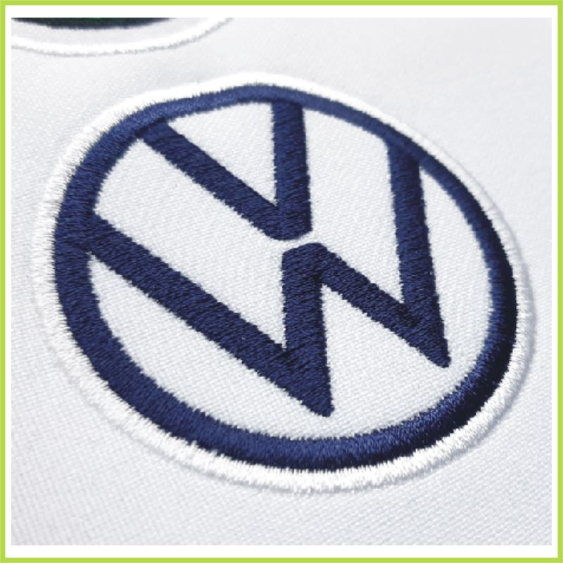 Dvojfarebná vyšívaná nášivka loga VOLKSWAGEN používaná od roku 2019 do teraz .