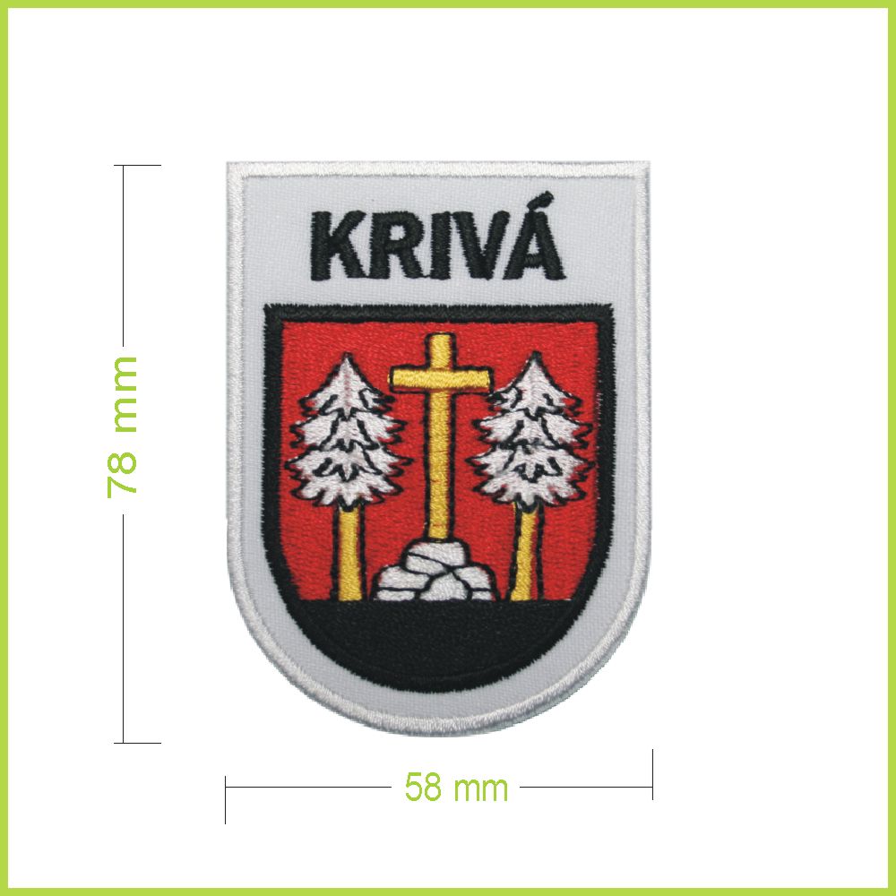 Štvorfarebná vyšívaná nášivka erbu obce Krivá.