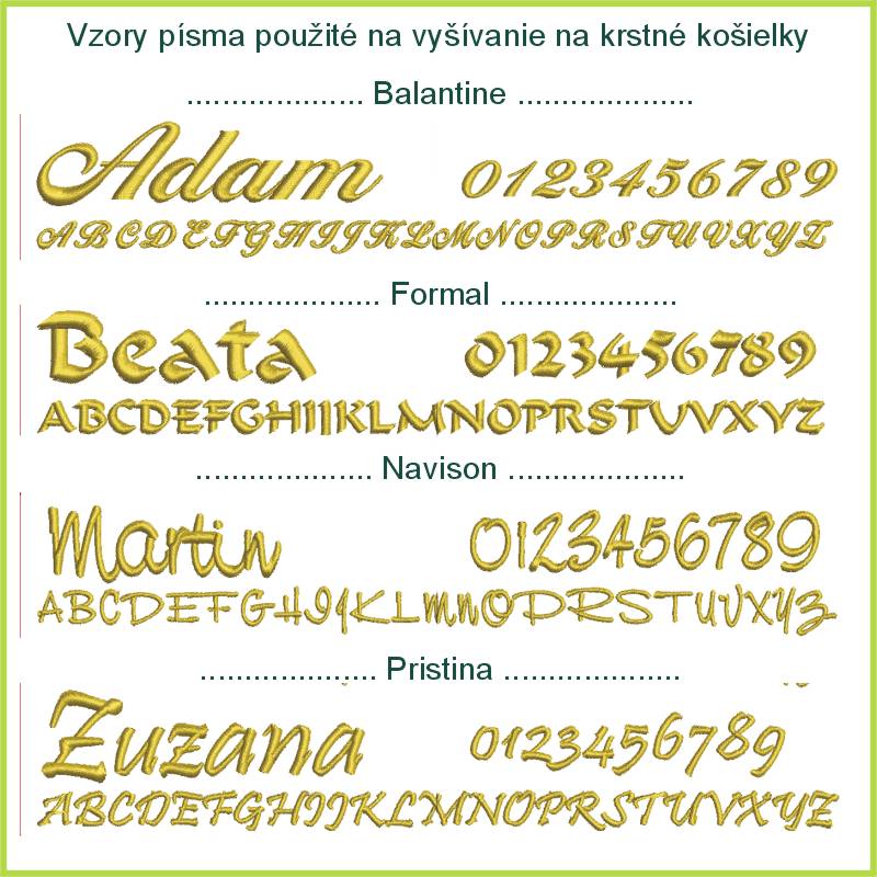 3. V treťom kroku v položke Písmo a varianta vyšitia vyberte štýl písma (4 druhy) a jeho rozloženie na krstnej košielke (2 druhy).