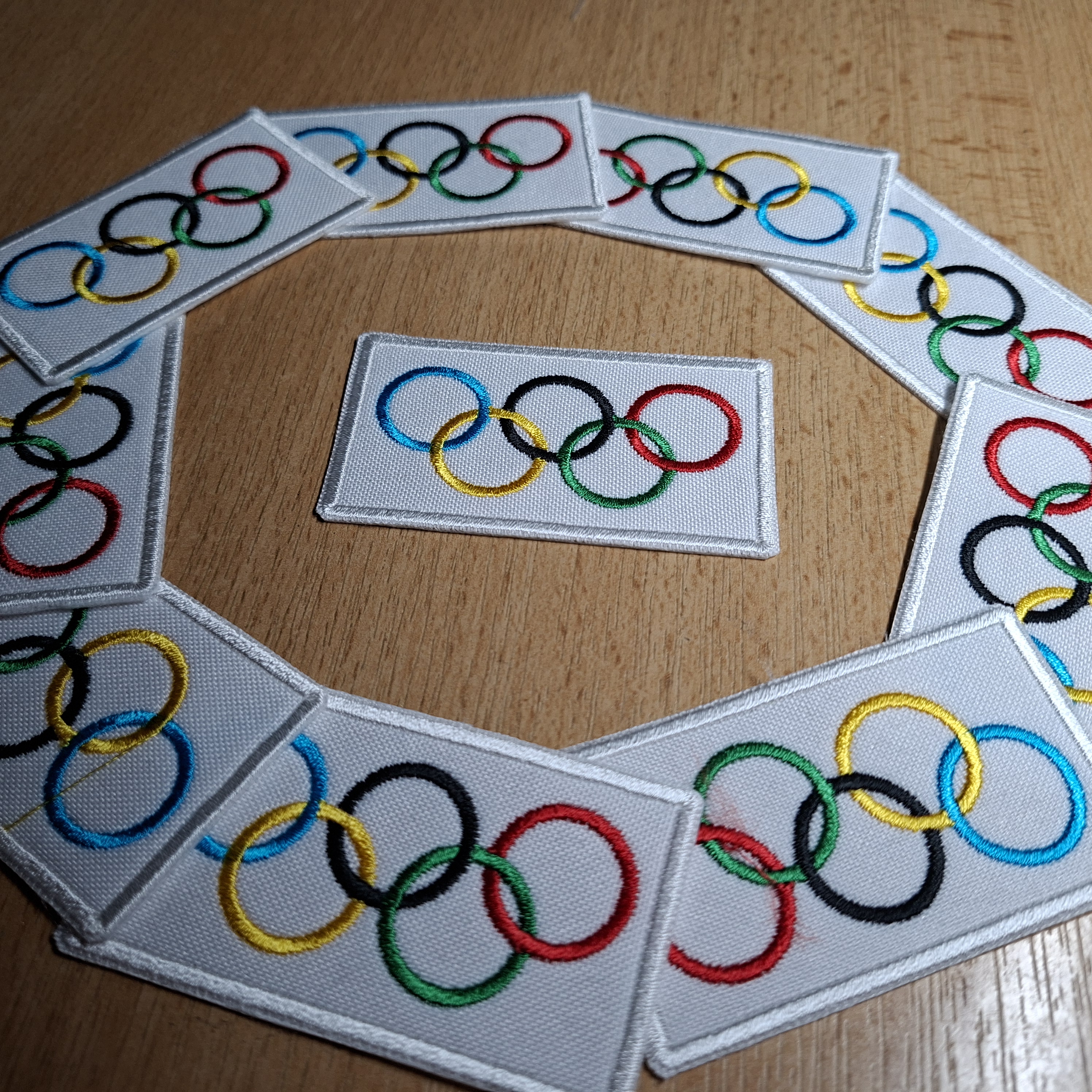 Šesť farebná vyšívaná nášivka olympijských kruhov.