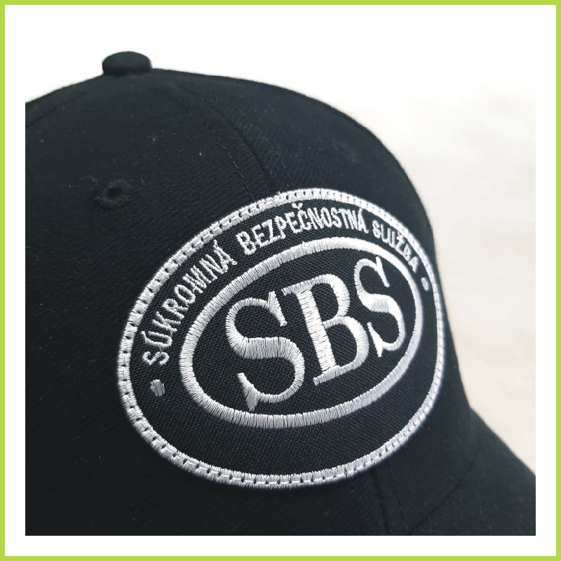 Dvojfarebná vyšívaná nášivka prišitá na prednom diely čiernej šiltovky.